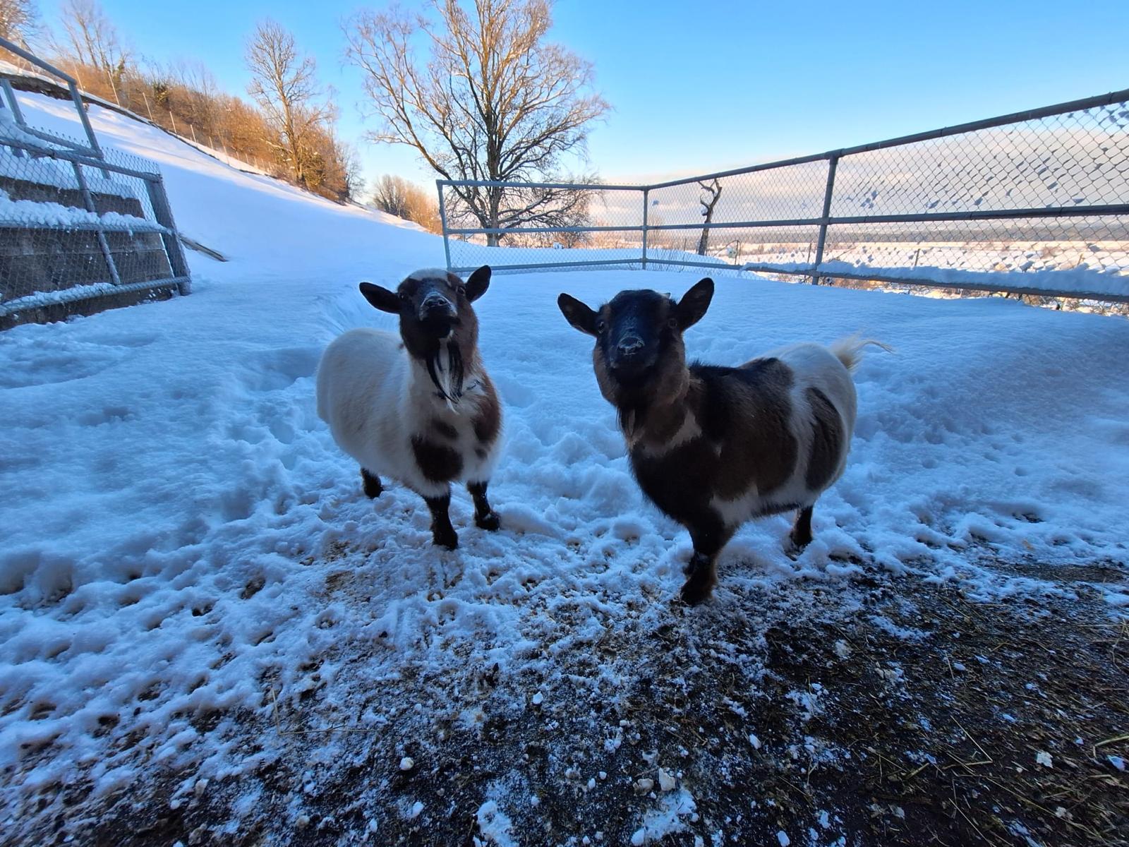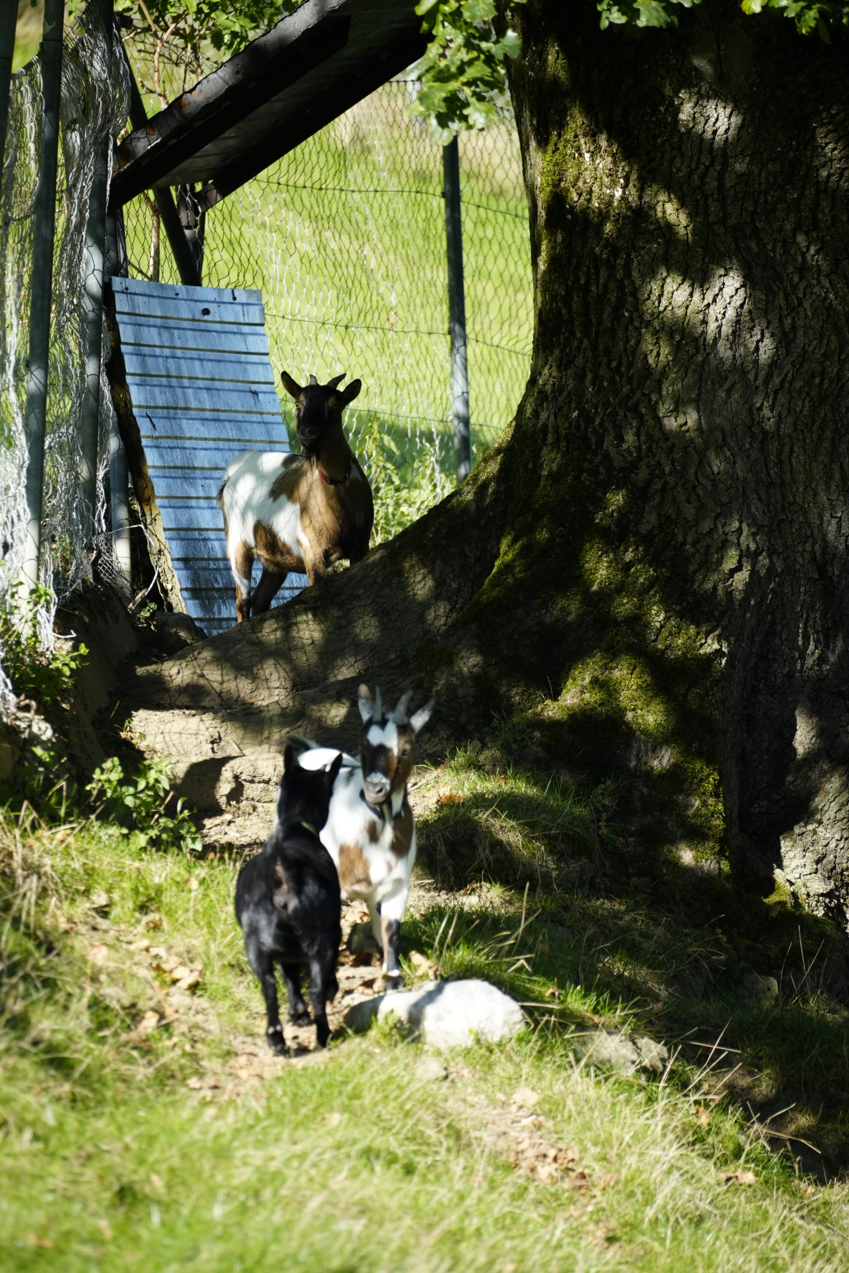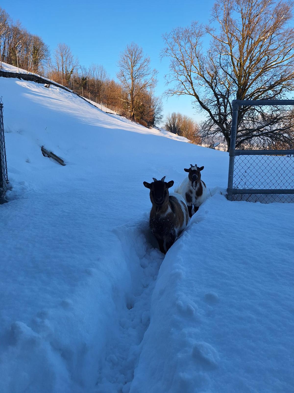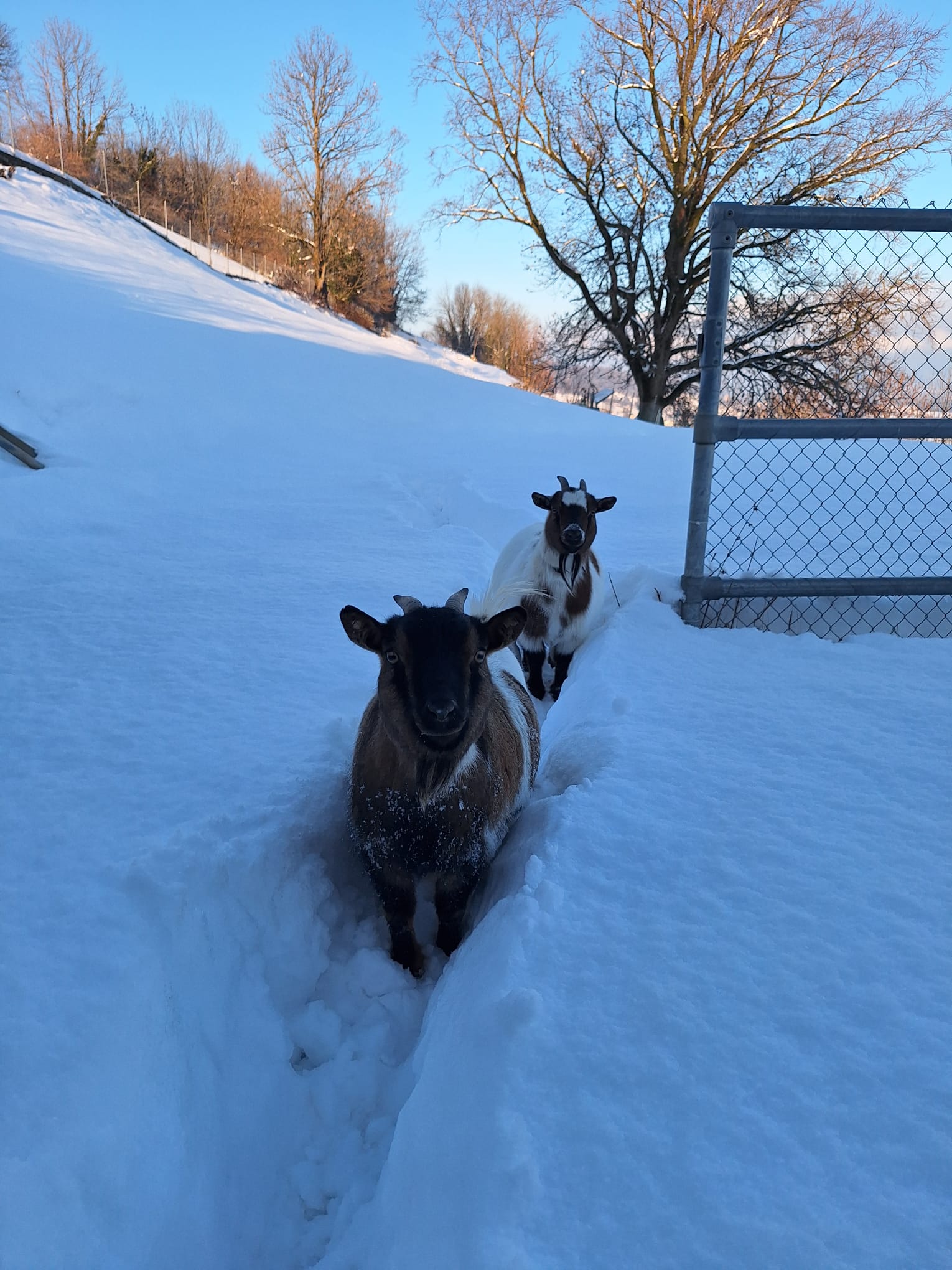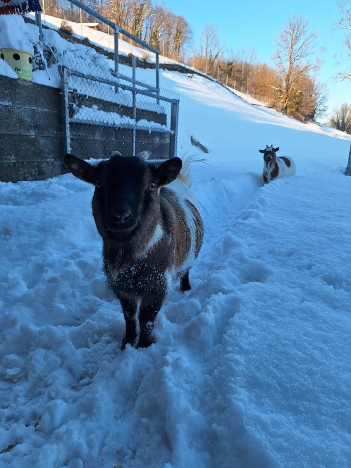 Agnes, Elvira und Marta gehören zu unseren jüngsten Familienmitgliedern. Anfang Juni 2025 bezogen sie ihr neues Zuhause bei uns im umgebauten Pferdestall. Seither zaubern sie mit ihrer lustigen, frechen und neugierigen Ziegen Art jedem ein Lächeln in Gesicht und machen uns eine grosse Freude. Die drei leben bei uns in einer Offenstallhaltung. Ob im Stall ein kleines Nickerchen machen oder auf der Weide die Büsche abknabbern, den dreien sind die Tore offen. Von Frühjahr bis Spätherbst finden sie ihre Nahrung auf der Weide. In den Wintermonaten bekommen Sie Heu aus eigener Erwirtschaftung. Ein Saltz Leckstein steht ihnen jederzeit zur Verfügung.